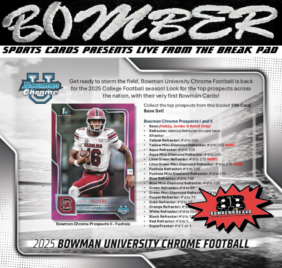 Get ready to storm the field, Bowman University Chrome Football is back for the 2025 College Football season! Look for the top prospects across the nation, with their very first Bowman Cards! Collect the top prospects from this loaded 200-Card Base Set!