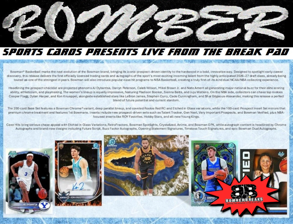 Bowman Basketball marks the next evolution of the Bowman brand, bringing its iconic prospect-driven identity to the hardwood in a bold, innovative way. Designed to spotlight early-career discovery, this release delivers the first officially licensed trading cards and autographs of the sport’s most exciting incoming talent from the highly anticipated 2026–27 draft class, already being touted as one of the strongest in years. Bowman will also introduce popular case hit programs to NBA Basketball, creating a truly first-of-its-kind dual NCAA/NBA collecting experience.